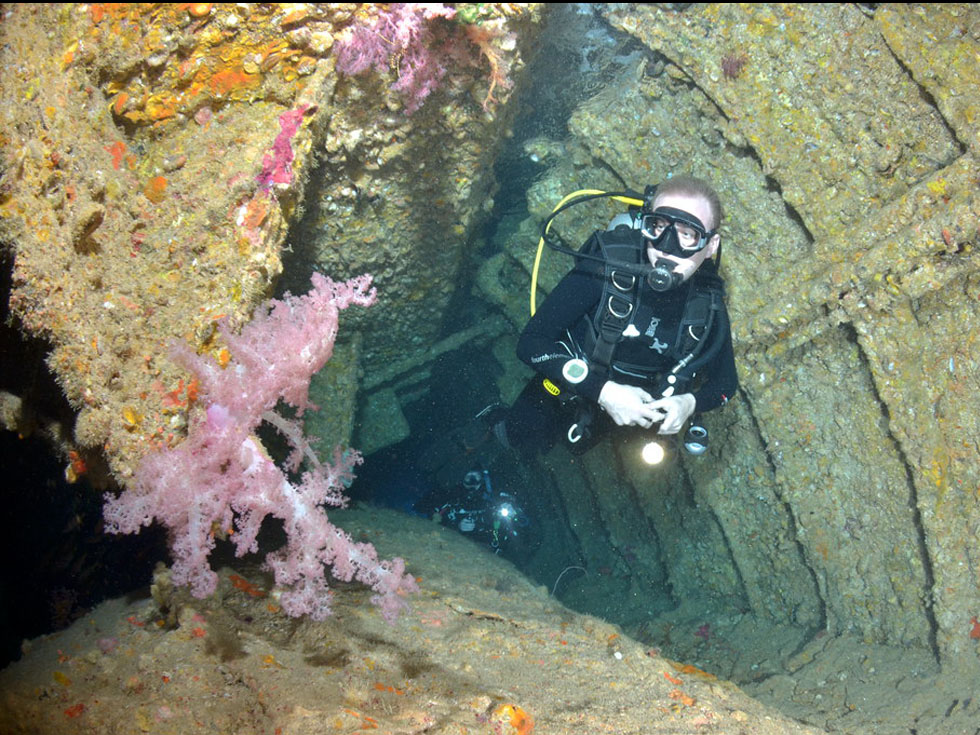 The site of the WWII British Merchant ship, which was sunk by the German Airforce in 1941. The ship is unique as she still rests the right way up, and still contains most of her cargo which is visible, should you enter the chambers below deck.